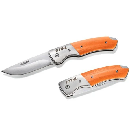 Składany nóż z blokadą ostrza, okładki z matowanej stali nierdzewnej i laminatu z włóknem szklanym w kolorze pomarańczowym. Nóż wytrzymuje ekstremalne obciążenia i idealnie sprawdza się podczas wypadów na świeżym powietrzu.