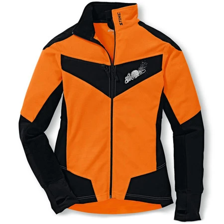 Miękka, bardzo elastyczna kurtka z mikropolaru. Kolor pomarańczowo-czarny. 97% poliester, 3% poliamid, przewiewna i szybkoschnąca, idealna jako warstwa pośrednia, podstawowe zabezpieczenie przed rozerwaniem, kieszeń na piersiach z zamkiem błyskawicznym, przelotka na kciuk, odblaskowy motyw pilarki łańcuchowej.